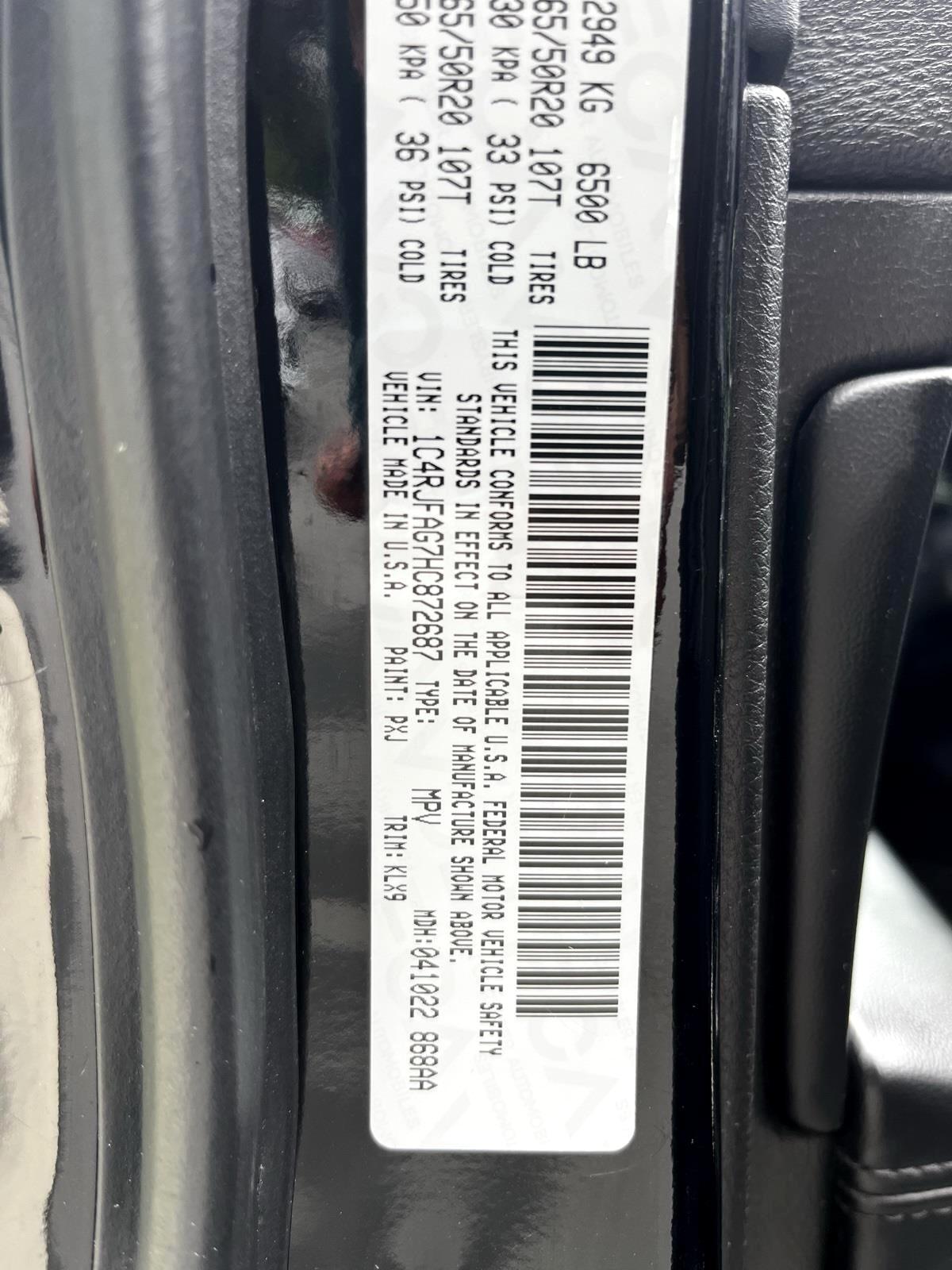 Diamond Black Crystal Pearlcoat 2017 Jeep Grand Cherokee Altitude 4WD 3.6L V6 24V VVT 8-Speed Automatic4WD, 1-Year SiriusXM Radio Service, 115V Auxiliary Power Outlet, 17" x 8.0" Aluminum Wheels, 3.45 Rear Axle Ratio, 4-Wheel Disc Brakes, 6 Month Trial (Registration Required), 6 Speakers, 8.4" Touchscreen Display, ABS brakes, Air Conditioning, Alloy wheels, Altitude Grille, Altitude IV Package, AM/FM radio, Anodized Gun Metal Interior Accents, Anti-whiplash front head restraints, Auto-Dimming Rear-View Mirror, Automatic temperature control, Black Suede Seats w/Black Stitching (DISC), Body Color Claddings, Body Color Fascia, Body Color Shark Fin Antenna, Brake assist, Bumpers: body-color, Cloth Low-Back Bucket Seats, Compass, Dark Day Light Opening Moldings, Dark Headlamp Bezel Finish, Dark Lens Taillamps, Delay-off headlights, Delete Laredo Badge, Driver door bin, Driver vanity mirror, Dual front impact airbags, Dual front side impact airbags, Electronic Stability Control, For Details Visit DriveUconnect.com, For More Info, Call 800-643-2112, Four wheel independent suspension, Front Accent/Body Color Fascia, Front anti-roll bar, Front Bucket Seats, Front Center Armrest w/Storage, Front dual zone A/C, Front fog lights, Front reading lights, Fully automatic headlights, Gloss Black Fascia Applique, Heated door mirrors, Illuminated entry, Instrument Cluster w/Off-Road Disp. Pages, Jeep Black Gloss Badging, Knee airbag, Leather Shift Knob, Low tire pressure warning, Normal Duty Suspension, Occupant sensing airbag, Outside temperature display, Overhead airbag, Overhead console, Panic alarm, ParkView Rear Back-Up Camera, Passenger door bin, Passenger vanity mirror, Power 4-Way Driver Lumbar Adjust, Power 8-Way Driver/Manual Passenger Seat, Power door mirrors, Power Liftgate, Power steering, Power Sunroof (DISC), Power windows, Quick Order Package 23Z Altitude (DISC), Radio data system, Radio: Uconnect 3 w/5" Display, Radio: Uconnect 3C w/8.4" Display, Rear Accent/Body Color Fascia, Rear anti-roll bar, Rear Fascia Gloss Black Step Pad, Rear reading lights, Rear seat center armrest, Rear window defroster, Rear window wiper, Remote keyless entry, Roadside Assistance & 9-1-1 Call, Security & Convenience Group, Security Alarm, Single Exhaust w/Bright Tip, SiriusXM Satellite Radio, Speed control, Speed-Sensitive Wipers, Split folding rear seat, Spoiler, Steering Wheel Mounted Audio Controls, Steering wheel mounted audio controls, Tachometer, Telescoping steering wheel, Tilt steering wheel, Traction control, Trip computer, Uconnect Access, Universal Garage Door Opener, Variably intermittent wipers, Wheels: 20" x 8.0" Gloss Black Aluminum (DISC), 4WD.