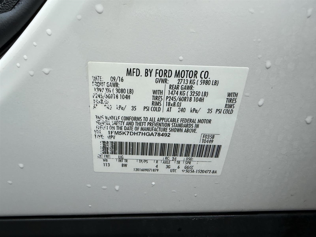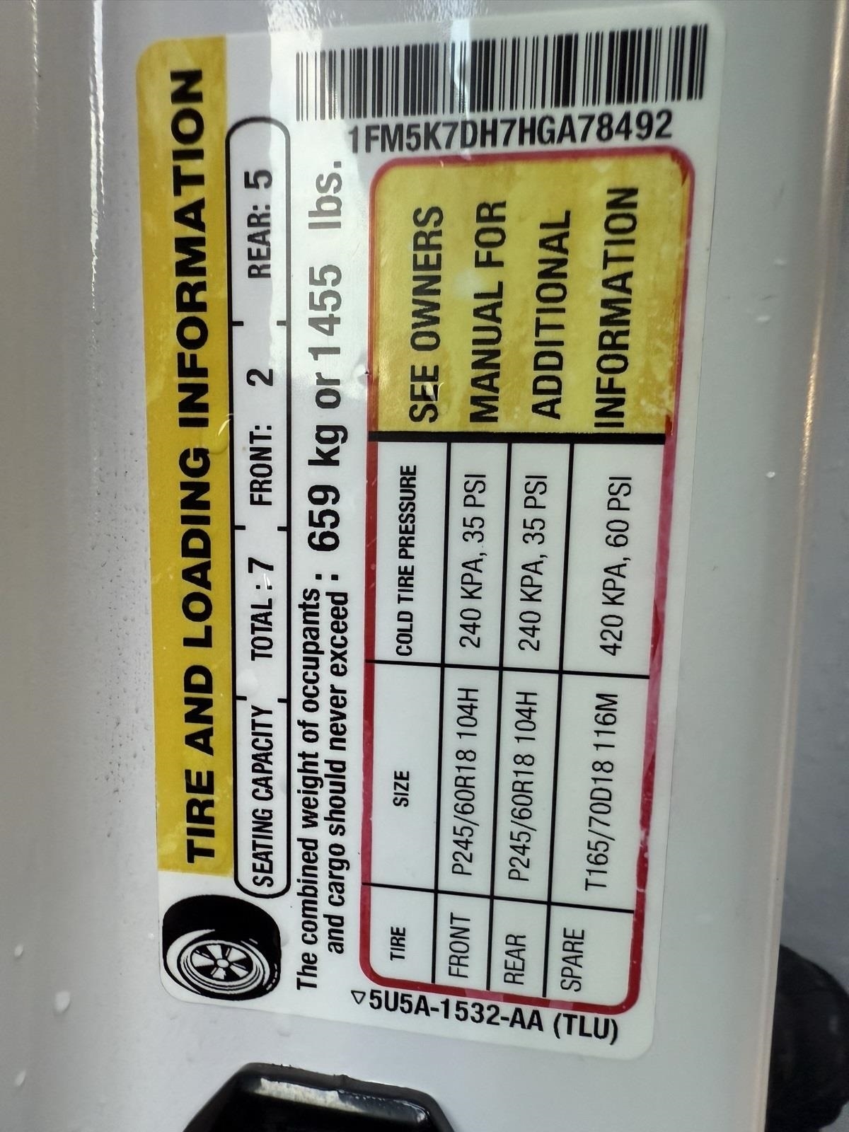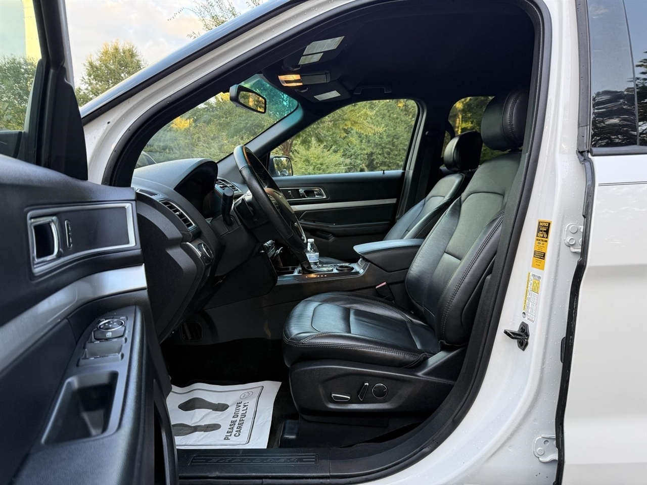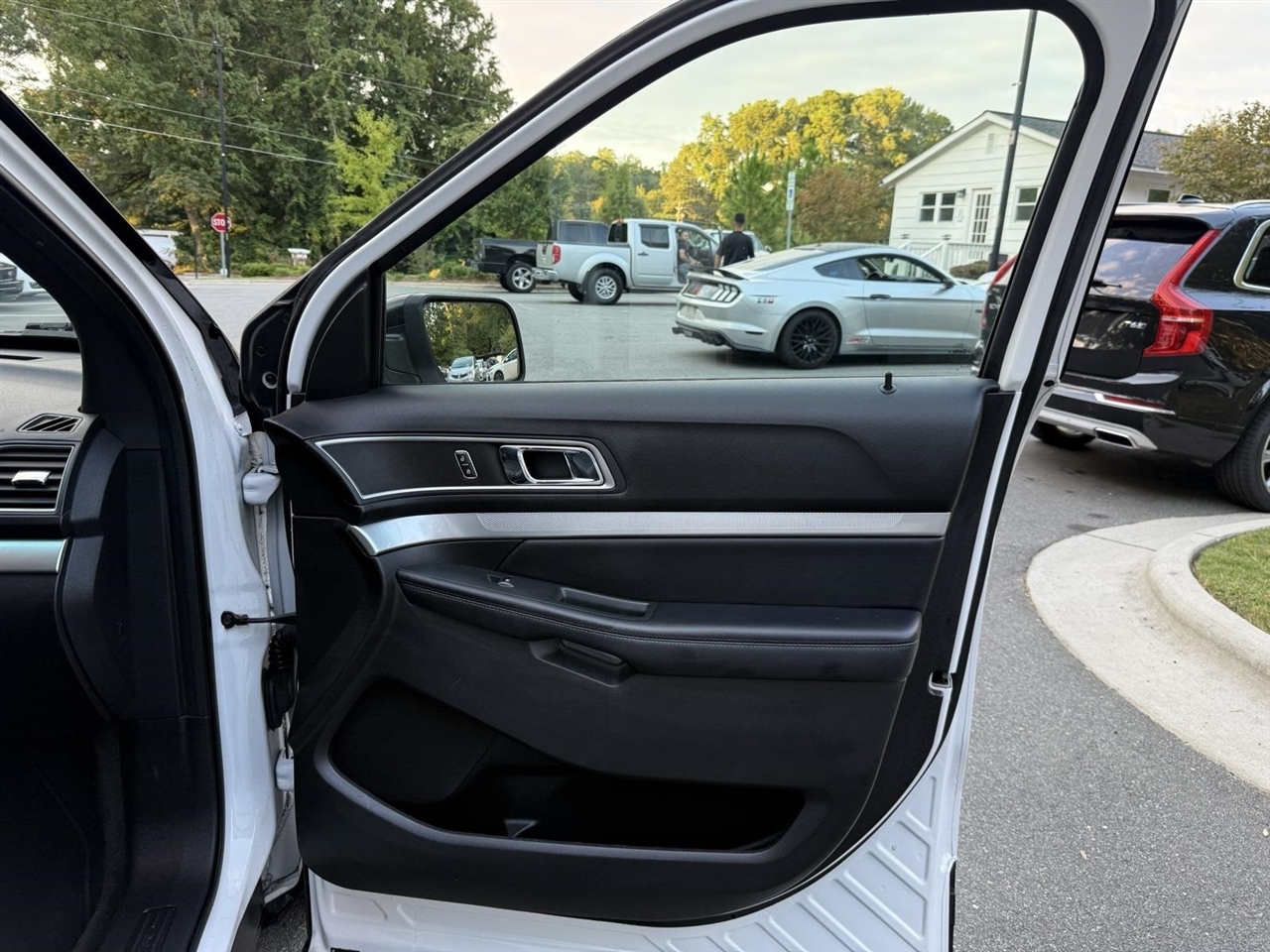 White Platinum Clearcoat Metallic 2017 Ford Explorer XLT FWD I4 6-Speed Automatic with Select-Shift18" Painted Aluminum Wheels, 3.39 Non-Limited-Slip Axle Ratio, 3rd row seats: split-bench, 4-Wheel Disc Brakes, 6 Speakers, ABS brakes, Air Conditioning, Alloy wheels, AM/FM radio: SiriusXM, Brake assist, Bumpers: body-color, CD player, Compass, Delay-off headlights, Driver door bin, Driver vanity mirror, Dual front impact airbags, Dual front side impact airbags, Electronic Stability Control, Emergency communication system: 911 Assist, Equipment Group 202A, Exterior Parking Camera Rear, Four wheel independent suspension, Front anti-roll bar, Front Bucket Seats, Front Center Armrest, Front fog lights, Front reading lights, Fully automatic headlights, Heated door mirrors, Illuminated entry, Knee airbag, Leather steering wheel, Low tire pressure warning, Occupant sensing airbag, Outside temperature display, Overhead airbag, Overhead console, Panic alarm, Passenger door bin, Passenger vanity mirror, Power door mirrors, Power driver seat, Power passenger seat, Power steering, Power windows, Radio: AM/FM Stereo w/Single-CD/MP3 Capable, Rear air conditioning, Rear anti-roll bar, Rear Parking Sensors, Rear reading lights, Rear seat center armrest, Rear window defroster, Rear window wiper, Remote keyless entry, Roof rack: rails only, Security system, Speed control, Speed-sensing steering, Speed-Sensitive Wipers, Split folding rear seat, Spoiler, Steering wheel mounted audio controls, SYNC Communication & Entertainment System, Tachometer, Telescoping steering wheel, Tilt steering wheel, Traction control, Trip computer, Turn signal indicator mirrors, Variably intermittent wipers, Voice-Activated Touchscreen Navigation System, XLT Technology Feature Bundle.