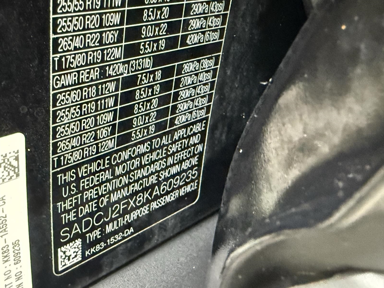 Corris Gray Metallic 2019 Jaguar F-PACE 25t Premium AWD 2.0L I4 Turbocharged 8-Speed Automatic11 Speakers, 3.73 Axle Ratio, 4-Wheel Disc Brakes, ABS brakes, Air Conditioning, Alloy wheels, AM/FM radio, Auto-dimming door mirrors, Auto-dimming Rear-View mirror, Automatic temperature control, Brake assist, Bumpers: body-color, Compass, Delay-off headlights, Driver door bin, Driver vanity mirror, Dual front impact airbags, Dual front side impact airbags, Electronic Stability Control, Emergency communication system: InControl Protect, Exterior Parking Camera Rear, Four wheel independent suspension, Front anti-roll bar, Front Bucket Seats, Front Center Armrest, Front dual zone A/C, Front reading lights, Fully automatic headlights, Garage door transmitter: HomeLink, Heated door mirrors, Illuminated entry, Leather steering wheel, Low tire pressure warning, LuxTec Seat Trim, Memory seat, Occupant sensing airbag, Outside temperature display, Overhead airbag, Overhead console, Panic alarm, Passenger door bin, Passenger vanity mirror, Power door mirrors, Power driver seat, Power Liftgate, Power moonroof, Power passenger seat, Power steering, Power windows, Radio data system, Radio: Meridian 380W Sound System, Rain sensing wipers, Rear anti-roll bar, Rear fog lights, Rear reading lights, Rear window defroster, Rear window wiper, Remote keyless entry, Security system, Speed control, Speed-sensing steering, Split folding rear seat, Spoiler, Steering wheel mounted audio controls, Tachometer, Telescoping steering wheel, Tilt steering wheel, Traction control, Trip computer, Turn signal indicator mirrors, Variably intermittent wipers, Wheels: 19" 5 Spoke (Style 5037).