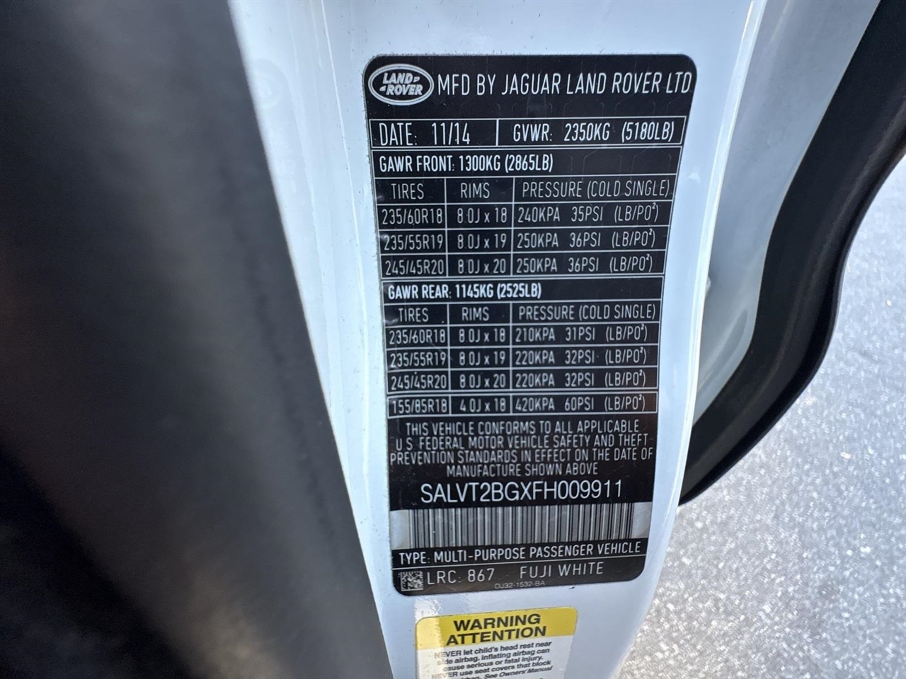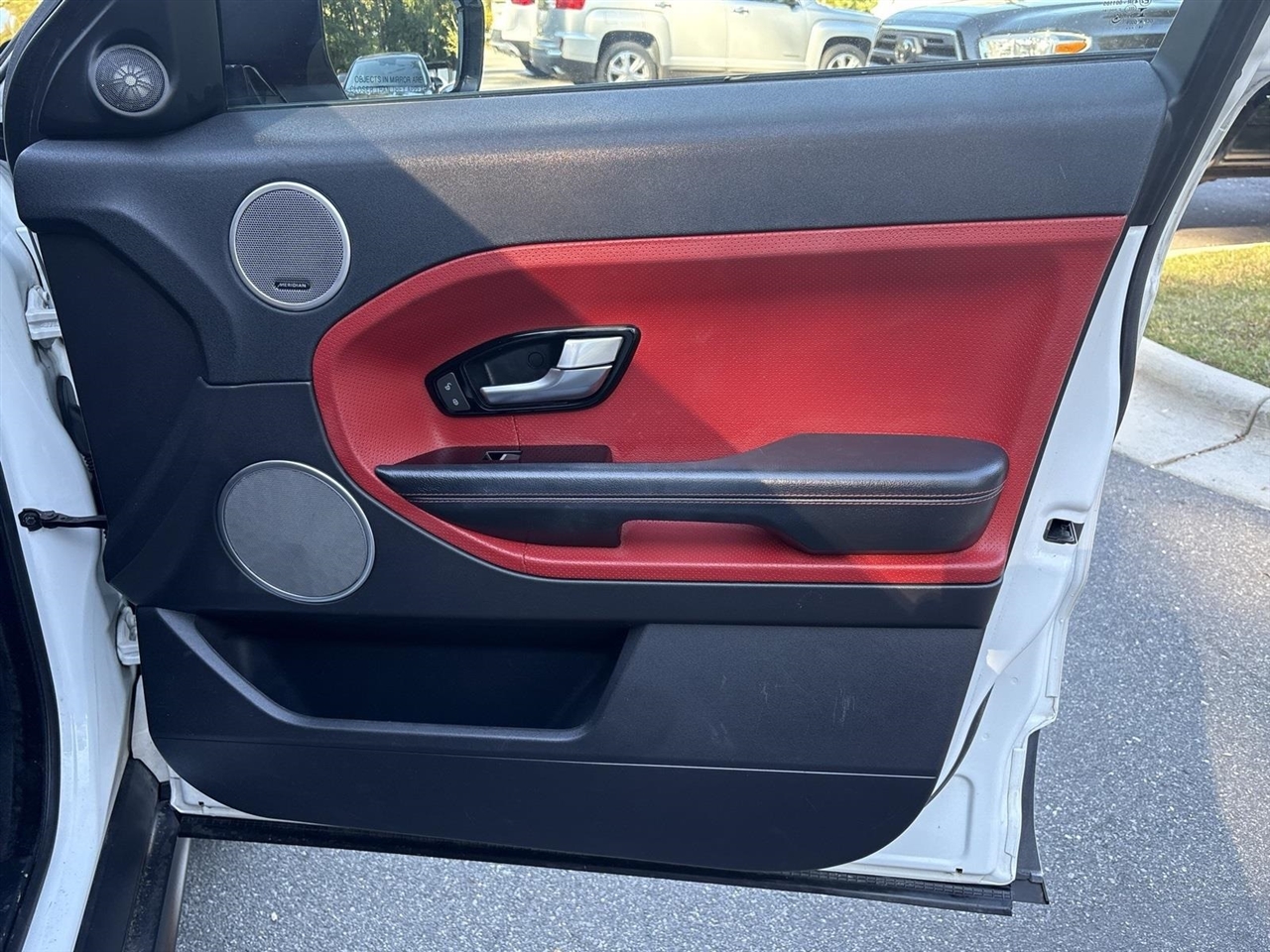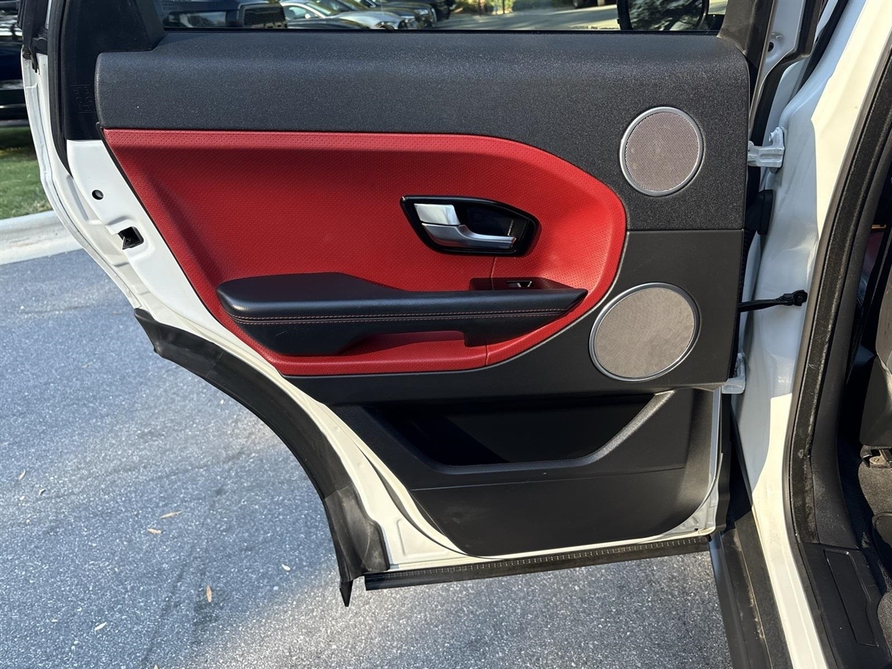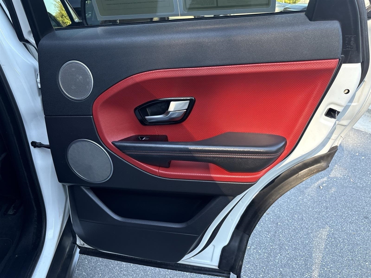 White 2015 Land Rover Range Rover Evoque Dynamic 4WD 2.0L I4 9-Speed Automatic17 Speakers, 20" Wheels, 3.75 Axle Ratio, 4-Wheel Disc Brakes, ABS brakes, Adaptive suspension, Air Conditioning, Alloy wheels, AM/FM radio: SIRIUS, Auto High-beam Headlights, Auto-dimming Rear-View mirror, Automatic temperature control, Brake assist, Bumpers: body-color, CD player, Delay-off headlights, Driver door bin, Driver vanity mirror, Dual front impact airbags, Dual front side impact airbags, Electronic Stability Control, Exterior Parking Camera Rear, Four wheel independent suspension, Front anti-roll bar, Front Bucket Seats, Front Center Armrest, Front dual zone A/C, Front fog lights, Front reading lights, Fully automatic headlights, Garage door transmitter: HomeLink, Headlight cleaning, Heated door mirrors, Heated Front Bucket Seats, Heated front seats, Heated rear seats, Heated steering wheel, High intensity discharge headlights: Bi-Xenon, Illuminated entry, Knee airbag, Leather steering wheel, Low tire pressure warning, Lumbar, Memory seat, Navigation System, Occupant sensing airbag, Outside temperature display, Overhead airbag, Panic alarm, Passenger door bin, Passenger vanity mirror, Perforated Leather Seat Trim, Power door mirrors, Power driver seat, Power Liftgate, Power passenger seat, Power steering, Power windows, Premium audio system: Meridian, Radio data system, Radio: Premium Navigation System, Rain sensing wipers, Rear anti-roll bar, Rear fog lights, Rear reading lights, Rear seat center armrest, Rear window defroster, Rear window wiper, Remote keyless entry, Security system, Speed control, Speed-sensing steering, Speed-Sensitive Wipers, Split folding rear seat, Spoiler, Steering wheel mounted audio controls, Tachometer, Telescoping steering wheel, Tilt steering wheel, Traction control, Trip computer, Turn signal indicator mirrors, Variably intermittent wipers, Wheels: 20" Alloy w/Sparkle Finish (4).