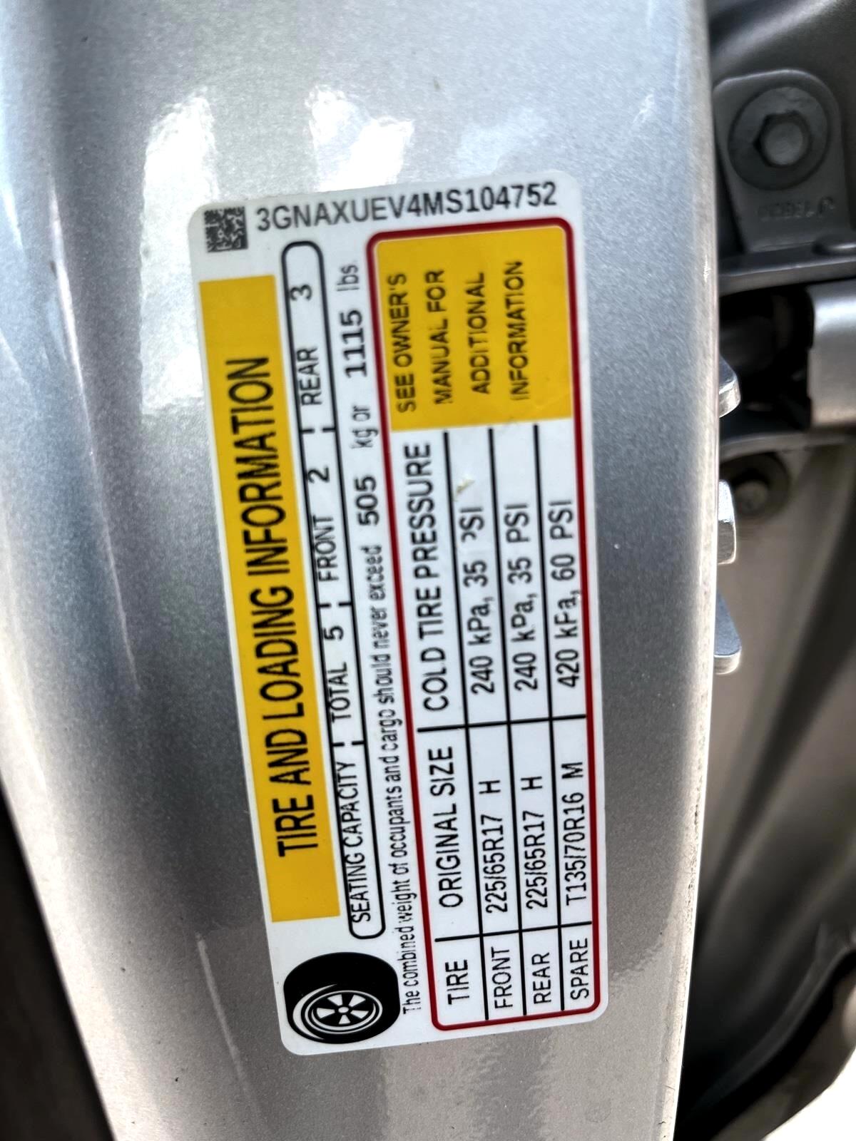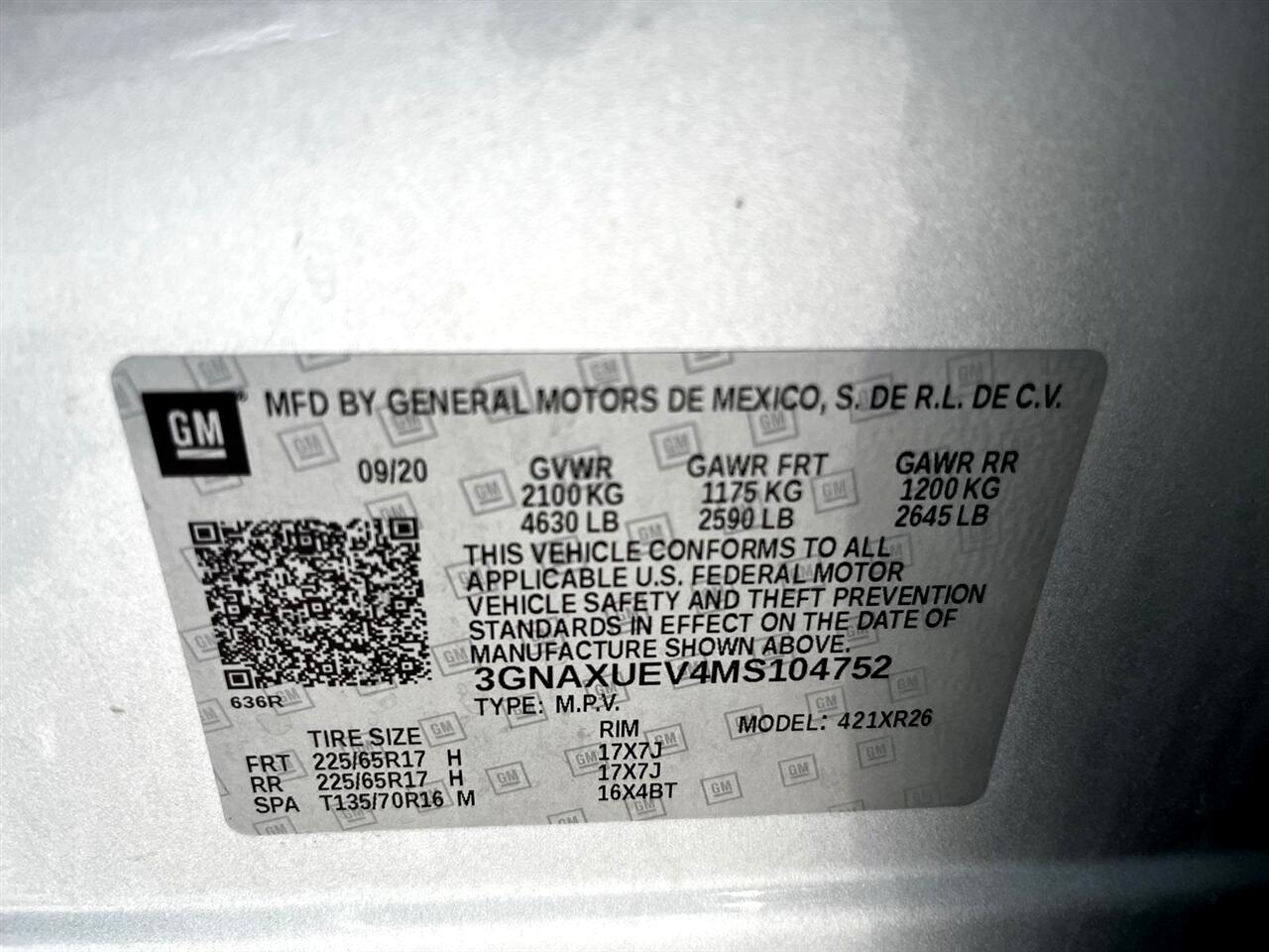 Silver Ice Metallic 2021 Chevrolet Equinox LT AWD 1.5L DOHC 6-Speed Automatic Electronic with Overdrive Clean CARFAX.AWD, 17" Aluminum Wheels, 2 Rear USB Charging-Only Ports, 2 USB Ports & Auxiliary Input Jack, 2-Way Power Driver Lumbar Control Seat Adjuster, 3.87 Final Drive Axle Ratio, 4-Wheel Disc Brakes, 6 Speaker Audio System Feature, 6 Speakers, 8-Way Power Driver Seat Adjuster, ABS brakes, Air Conditioning, Alloy wheels, AM/FM radio: SiriusXM, Apple CarPlay/Android Auto, Auto High-beam Headlights, Bluetooth® For Phone, Brake assist, Bumpers: body-color, Cold Air Grille Shutter, Compass, Delay-off headlights, Driver door bin, Driver vanity mirror, Dual front impact airbags, Dual front side impact airbags, Electronic Stability Control, Emergency communication system: OnStar and Chevrolet connected services capable, Four wheel independent suspension, Front anti-roll bar, Front Bucket Seats, Front Center Armrest, Front Passenger 4-Way Manual Seat Adjuster, Front reading lights, Fully automatic headlights, Heated door mirrors, High-Intensity Discharge Headlights, Illuminated entry, Low tire pressure warning, Occupant sensing airbag, Outside temperature display, Overhead airbag, Overhead console, Panic alarm, Passenger door bin, Passenger vanity mirror, Power door mirrors, Power driver seat, Power steering, Power windows, Preferred Equipment Group 1LT, Premium audio system: Chevrolet Infotainment 3, Premium Cloth Seat Trim, Radio data system, Radio: Chevrolet Infotainment 3 System w/AM/FM, Rear anti-roll bar, Rear reading lights, Rear seat center armrest, Rear window defroster, Rear window wiper, Remote keyless entry, Security system, SiriusXM Radio, Speed control, Speed-sensing steering, Split folding rear seat, Spoiler, Steering wheel mounted audio controls, Tachometer, Telescoping steering wheel, Tilt steering wheel, Traction control, Trip computer, Variably intermittent wipers, AWD.