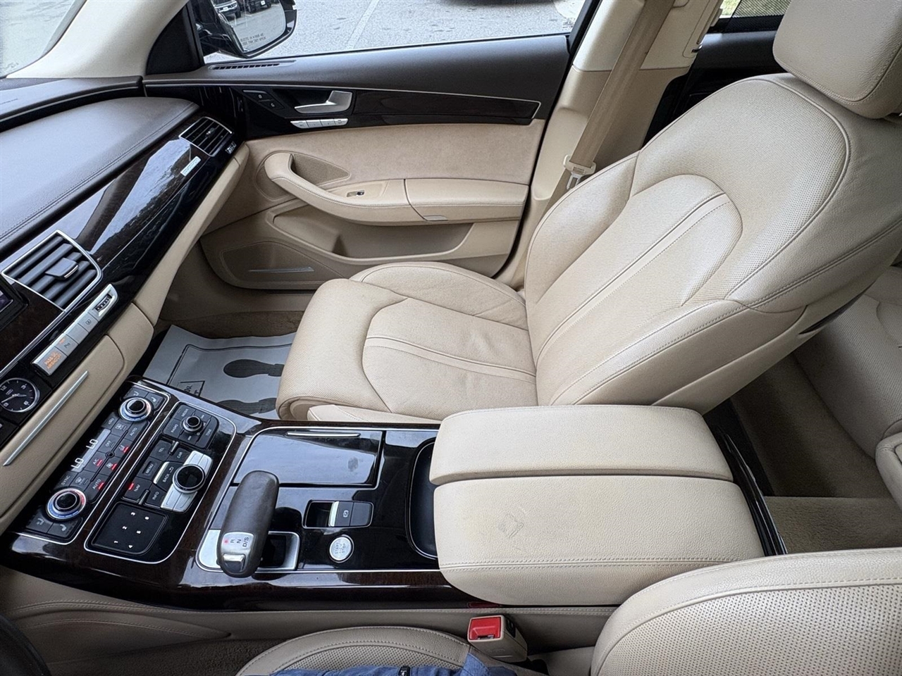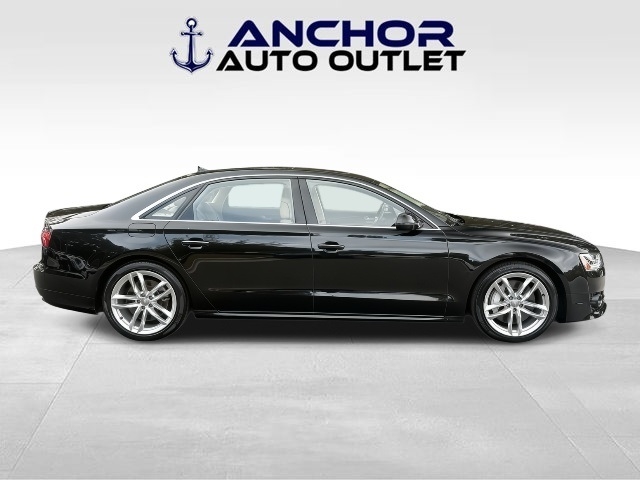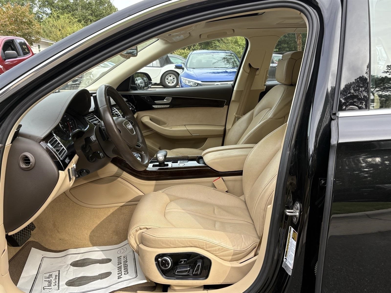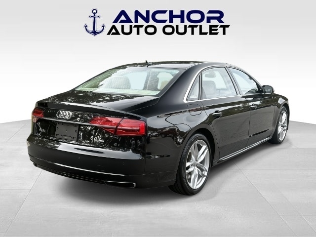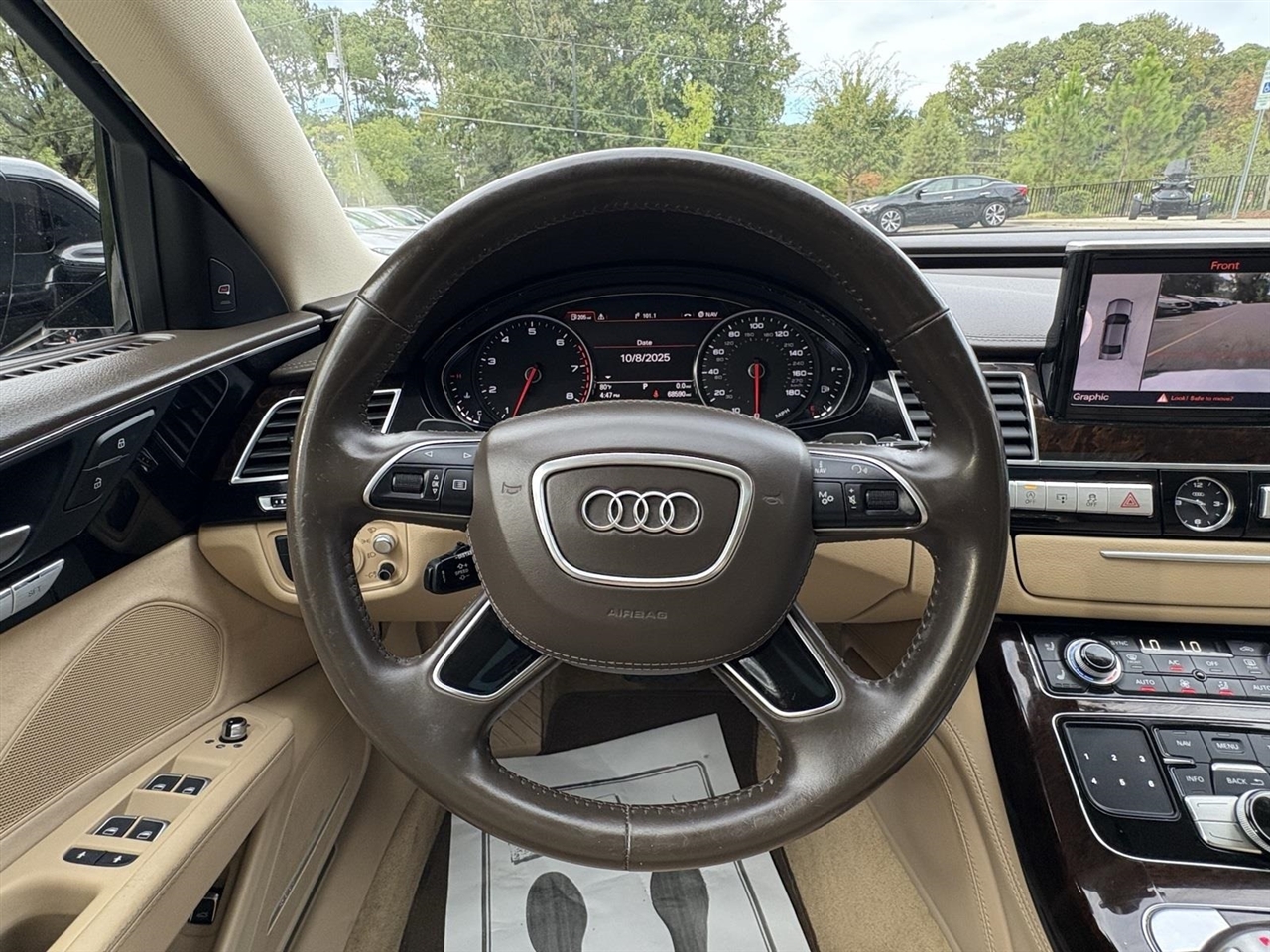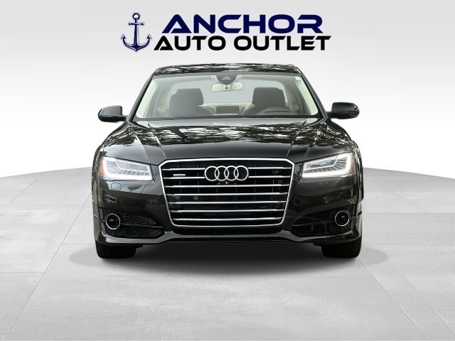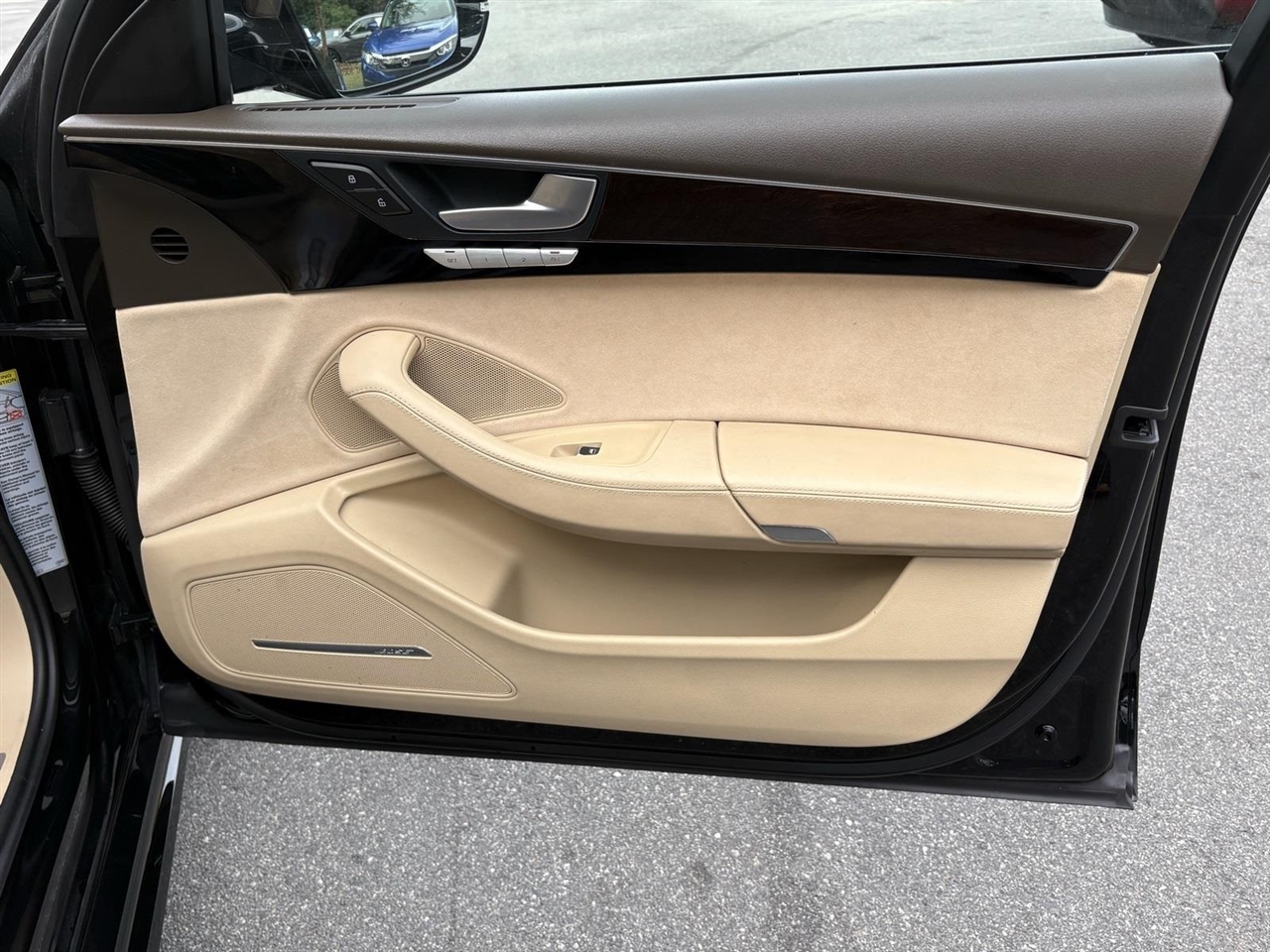 Black Metallic 2017 Audi A8 L 3.0T quattro quattro 3.0L V6 Turbocharged DOHC 24V ULEV II 333hp 8-Speed Automatic with TiptronicVelvet Beige Leather, 14 Speakers, 18-Way Power Heated Front Seats w/Memory, 22-Way Power Heated Front Comfort Sport Seats, 4-Spoke Multifunction Heated Steering Wheel, 4-Wheel Disc Brakes, ABS brakes, Adaptive suspension, Air Conditioning, Alloy wheels, AM/FM radio: SiriusXM, Assam Gray Vavona Wood Upper Inlays, Audi Active Lane Assist, Audi Adaptive Cruise Control w/Stop & Go, Audi Beam-Rings, Audi First Aid Kit, Audi Guard All-Weather Floor Mats, Audi Head-Up Display, Audi Side Assist w/Pre Sense Rear, Auto tilt-away steering wheel, Auto-dimming door mirrors, Auto-dimming Rear-View mirror, Auto-leveling suspension, Automatic temperature control, Bose Surround Sound System w/AudioPilot, Brake assist, Bumpers: body-color, CD player, Compass, Delay-off headlights, DELETE Front License Plate Holder, Door auto-latch, Driver Assistance Package, Driver door bin, Driver vanity mirror, Dual front impact airbags, Dual front side impact airbags, DVD-Audio, Electronic Stability Control, Executive Package, Exterior Parking Camera Rear, Four wheel independent suspension, Front anti-roll bar, Front Bucket Seats, Front dual zone A/C, Front fog lights, Front reading lights, Front Seat Ventilation with Massage, Garage door transmitter: HomeLink, Genuine wood console insert, Head restraints memory, Headlight cleaning, Heated door mirrors, Heated front seats, High-Beam Assistant, HVAC memory, Illuminated entry, Knee airbag, Leather Shift Knob, Leather steering wheel, Low tire pressure warning, Memory seat, Navigation System, Occupant sensing airbag, Outside temperature display, Overhead airbag, Overhead console, Panic alarm, Panoramic Sunroof, Passenger door bin, Passenger vanity mirror, Power adjustable front head restraints, Power door mirrors, Power driver seat, Power moonroof, Power passenger seat, Power steering, Power windows, Radio data system, Radio: Audi MMI Navigation Plus System, Rain sensing wipers, Rear air conditioning, Rear anti-roll bar, Rear dual zone A/C, Rear fog lights, Rear Heated Seats, Rear reading lights, Rear seat center armrest, Rear Seat Pass-Through, Rear side impact airbag, Rear Window Blind, Rear window defroster, Remote keyless entry, Seatbelt memory, Security system, Speed control, Speed-Sensitive Wipers, Steering wheel memory, Steering wheel mounted audio controls, Tachometer, Telescoping steering wheel, Tilt steering wheel, Topview Camera System (Front, Rear & Side Views), Traction control, Trip computer, Turn signal indicator mirrors, Valetta Leather Seat Upholstery, Variably intermittent wipers, Wheels: 9" x 19" 15-Spoke-Design Alloy, Wheels: 9" x 20" 10-Spoke-Star Design, Wheels: 9" x 20" 5-Double-Spoke Galvano Silver, Velvet Beige Leather.